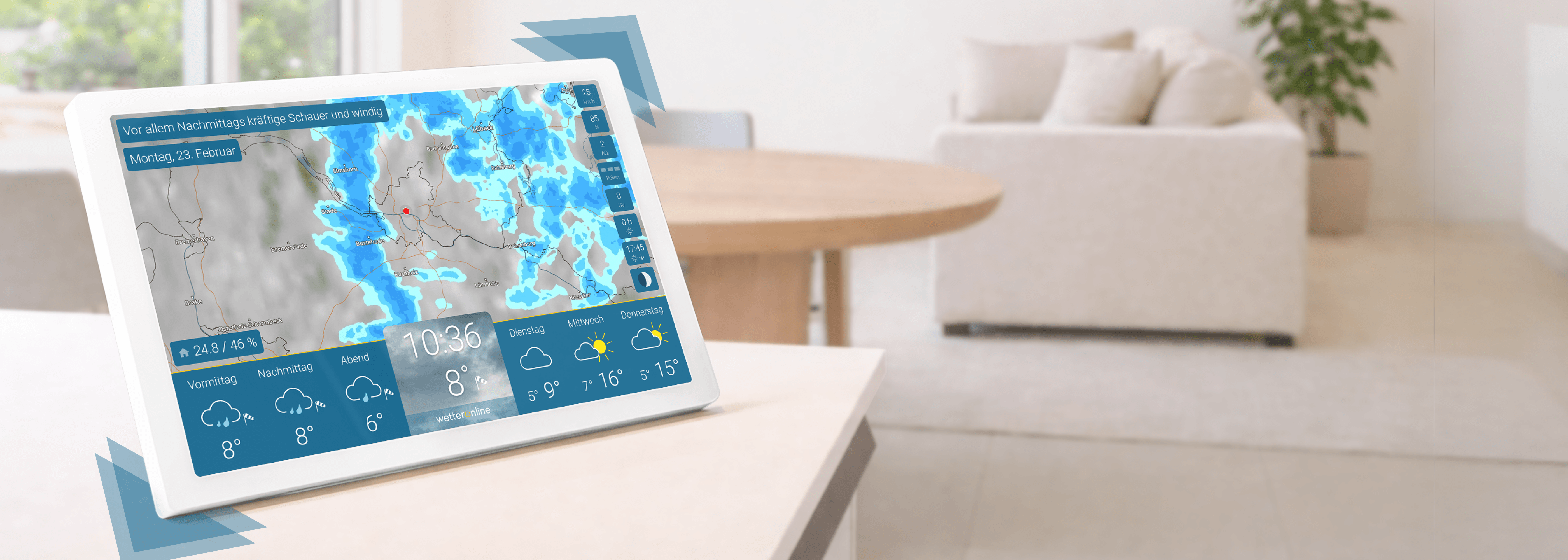 Als Produkt von WetterOnline wird wetteronline home mit Premium-Wetterdaten beliefert. Diese sind für dich und dein Zuhause maßgeschneidert und veredelt – präzise, werbefrei und immer aktuell.