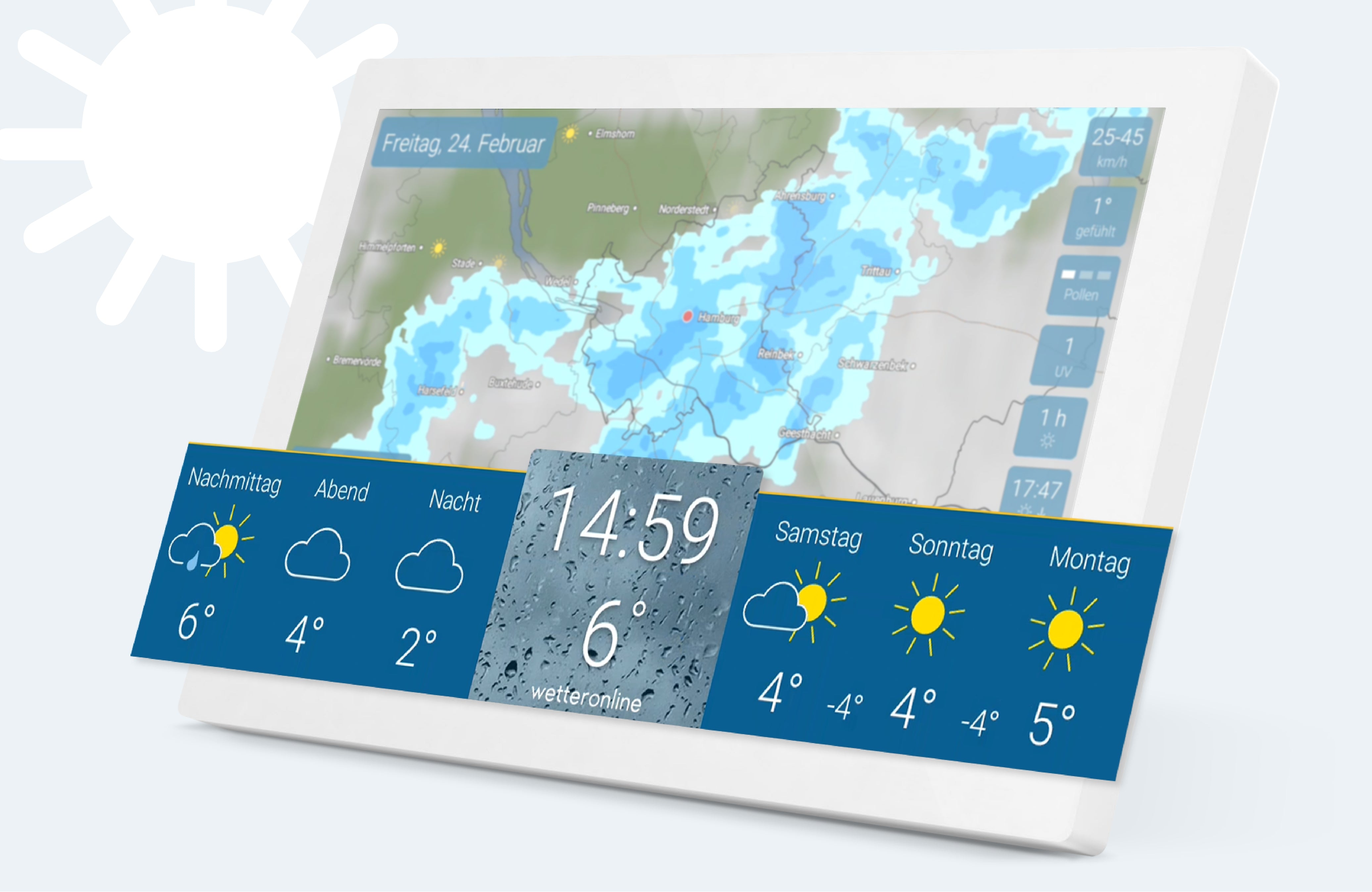 Das Gerät zeigt in einer übersichtlichen Darstellung Informationen zum aktuellen Wetter für einen weltweit per Ortung ermittelten Ort auf einem blickwinkelstabilen HD-Display an. Mit dem WetterRadar verfolgen Sie das Wetter live für die nächsten 90 Minuten. Zoomen Sie nah heran für mehr Details oder weiter heraus, um die künftige Wetterentwicklung einschätzen zu können. Der WetterTrend zeigt die Wettervorhersage für heute und die nächsten Tage. Die Wetterstation warnt vor Unwettern. Auch ergänzende Wetterinformationen können Sie nach Wunsch einblenden.