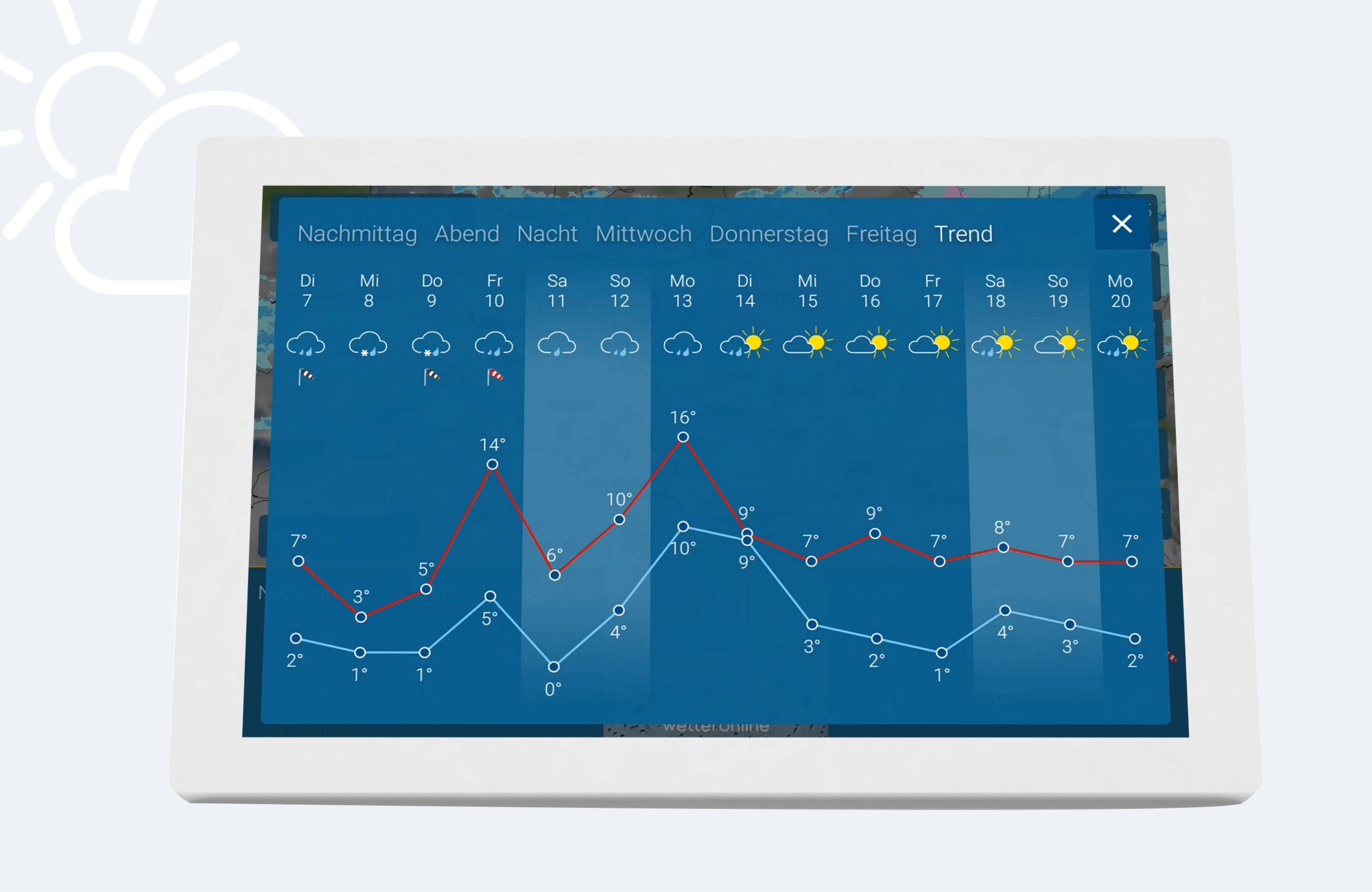Tippen Sie in der Intervallansicht des Vorhersagetages auf den Menüpunkt „Trend“, sehen Sie den Wettertrend der nächsten 14 Tage mit Temperaturverlauf.